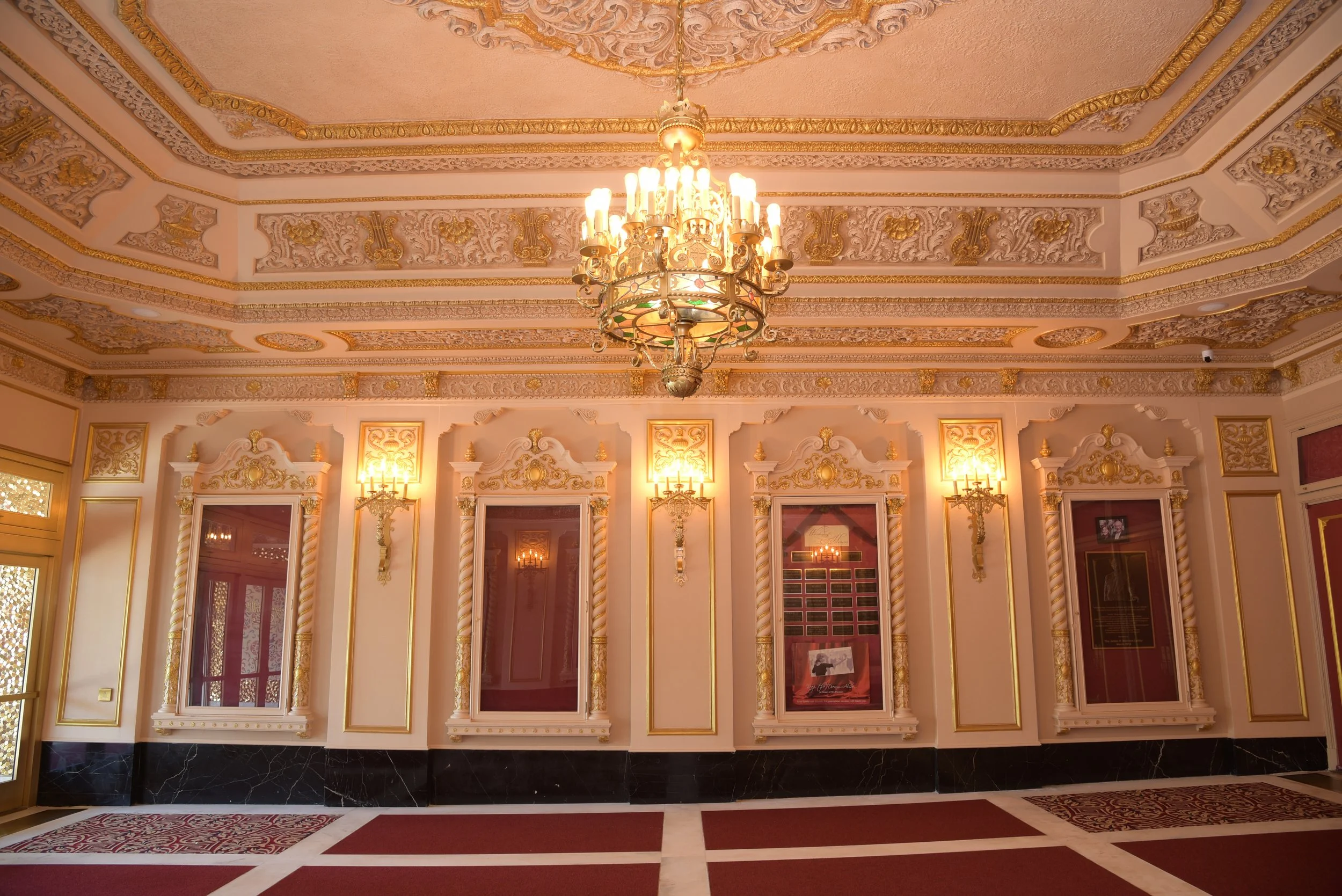 In Phase 2, the team restored the full Entry Sequence from the street to the inner lobby. The street entrance Porch, Box Office Lobby, were fully restored. In addition to restoring the grandeur of all the historic plaster lighting and grillwork elements, new sets ADA compliant sets of bronze and glass entry doors with transoms above, and a new lobby sound system were designed and installed.